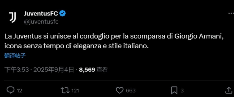 尤文官方写道:“尤文图斯俱乐部对乔治-阿玛尼的逝世表示哀悼,他是意大利优雅与风格的永恒象征。”