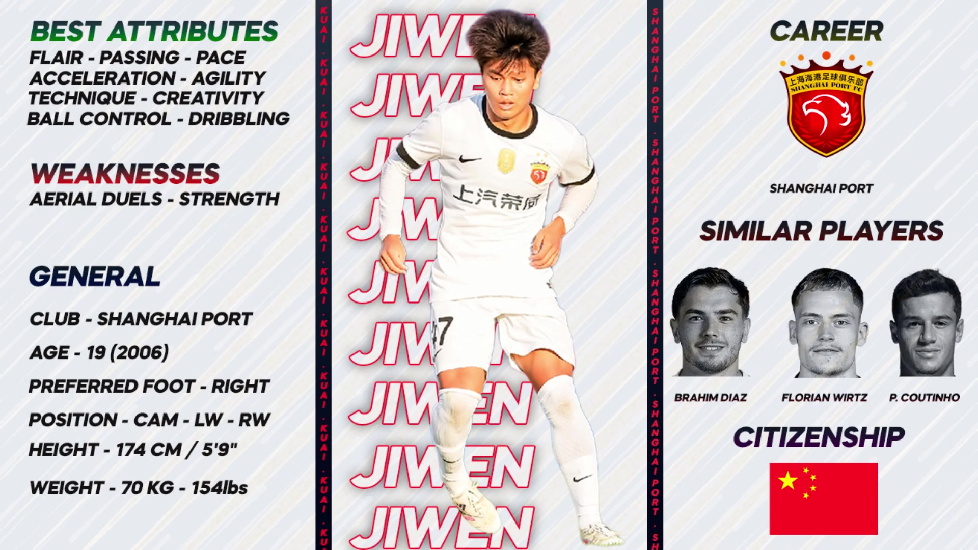 在该视频中,博主详细列举了蒯纪闻的技术特点,其优势包括天赋、传球能力、速度、加速、敏捷性、技术细腻度、创造力、控球和盘带;而相对薄弱环节则为空中对抗与身体力量。报告中还提出了三位风格相似的球员模板:布拉欣-迪亚斯、弗洛里安·维尔茨以及菲利佩·库蒂尼奥。