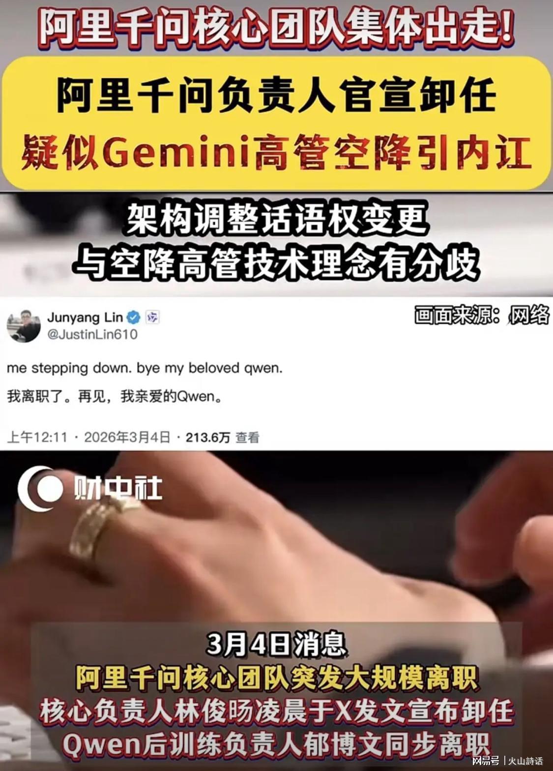 凤凰网科技从多位接近阿里的人士处了解到,这次离开确实很突然,事发在3月3日下午,一场内部会议后,双方产生分歧,林俊旸当场离开。随后在几小时后,其个人在X平台官方宣布了这一消息。